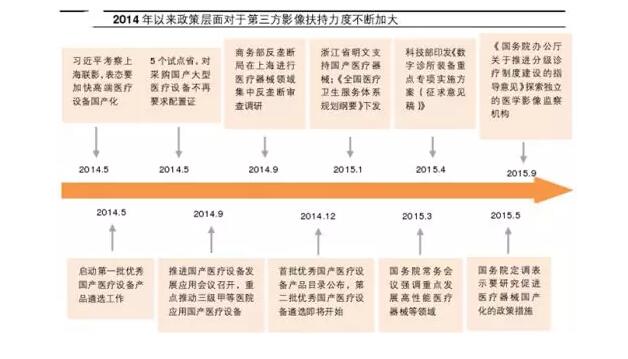 國內(nèi)的醫(yī)學(xué)影像中心復(fù)制了這種模式,但初期受限于人才引進(jìn)難、資金籌集少、隱形歧視和政策限制等原因,彼時獨立醫(yī)學(xué)影像中心在國內(nèi)發(fā)展緩慢。2016年8月,衛(wèi)計委發(fā)布《醫(yī)學(xué)影像診斷中心基本標(biāo)準(zhǔn)和管理規(guī)范(試行)》,首次明確了第三方醫(yī)學(xué)影像診斷中心獨立法人地位,其后隨著“十三五”醫(yī)改規(guī)劃中“加快社會辦醫(yī)”的內(nèi)容推出和醫(yī)療改革的不斷推進(jìn),行業(yè)終于迎來轉(zhuǎn)機(jī)。