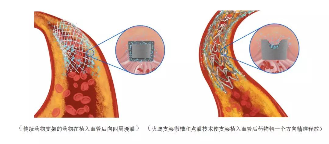 怎樣把藥物完美地“保存”在支架上?經(jīng)過反復設(shè)計和比較,火鷹研發(fā)團隊歷時15年,選擇并達成了技術(shù)上最難實現(xiàn)的一種方案——微槽包裹藥物,即在金屬支架表面用激光刻槽,再把藥物灌入槽內(nèi)。和傳統(tǒng)技術(shù)的區(qū)別在于,刻槽可防止涂層在輸送過程中脫落,藥物不會流失,且藥物抵達血管病變區(qū)后,能通過固定的槽位精準釋放,大幅提高了有效性,也避免了浪費。