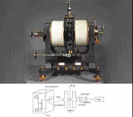 因為毛細(xì)管靜電計的毛細(xì)血管不可能做的太細(xì),他無法測到更精確的電流,愛因托芬改進(jìn)了這個裝置,他利用通電的導(dǎo)體可以產(chǎn)生磁場的安培右手定律發(fā)明了----磁電式儀表。愛因托芬把提高靈敏度的任務(wù)完全交給超大的電磁鐵,而動圈以匝數(shù)最少,質(zhì)量最輕為目標(biāo)。最終的結(jié)果是1895年推出的弦線式電流計---看清楚還不是心電圖機(jī)。
